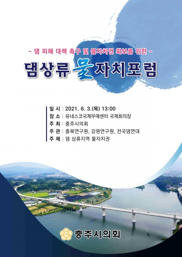 충주시의회(의장 천명숙)는 3일 오후 1시 유네스코국제무예센터에서 댐 피해 대책 촉구 및 물 자치권 회복을 위한 ‘댐 상류 물자치포럼’을 개최한다.